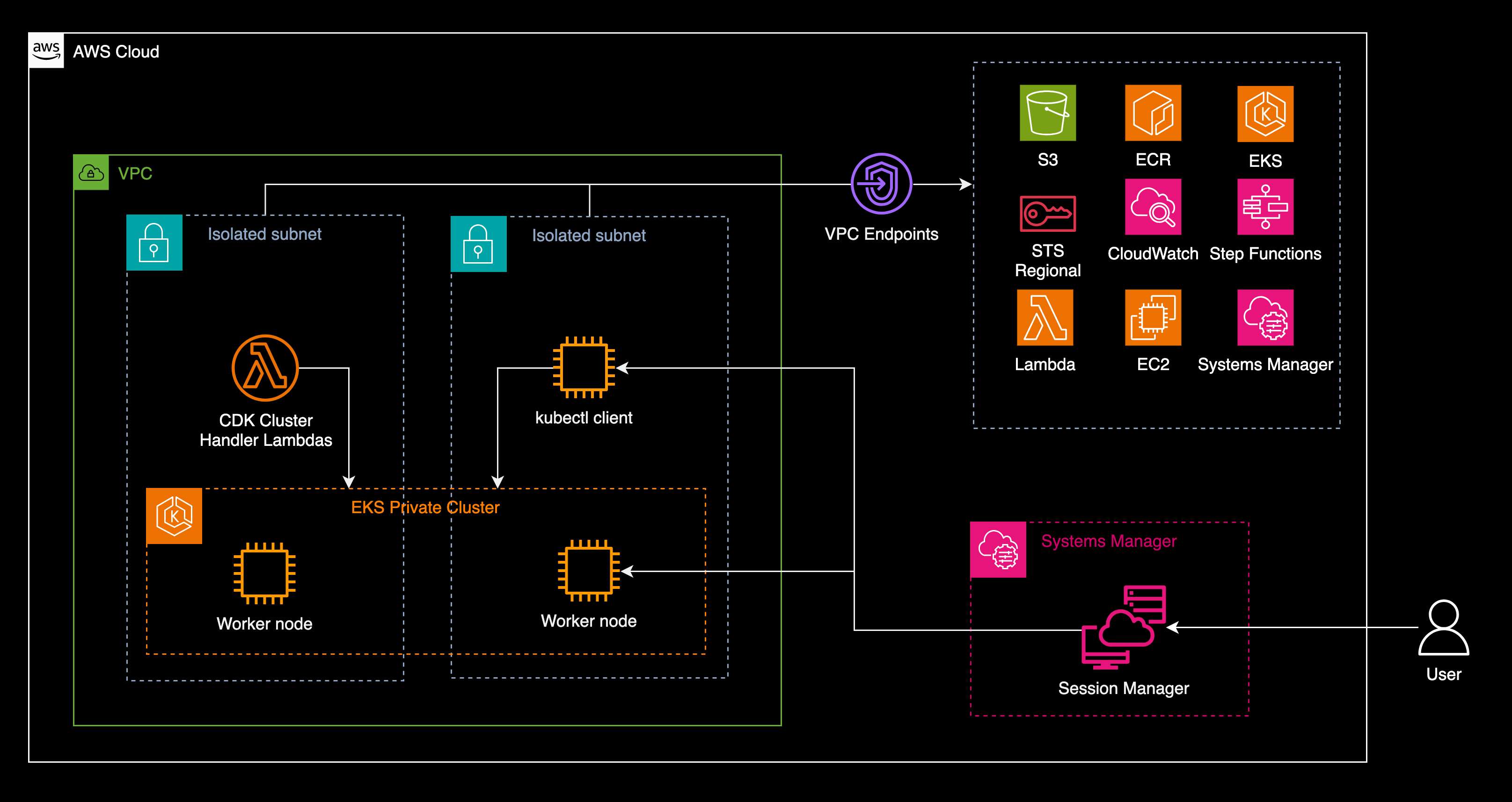 Lastly, CDK and its constructs use AWS Lambda cluster handler functions and AWS Step Functions to manage the creation and monitoring of the EKS cluster so VPC endpoints to these services are also required. For Lambda it is com.amazonaws.[region].lambda and for Step Functions you need com.amazonaws.[region].states and com.amazonaws.[region].sync-states.